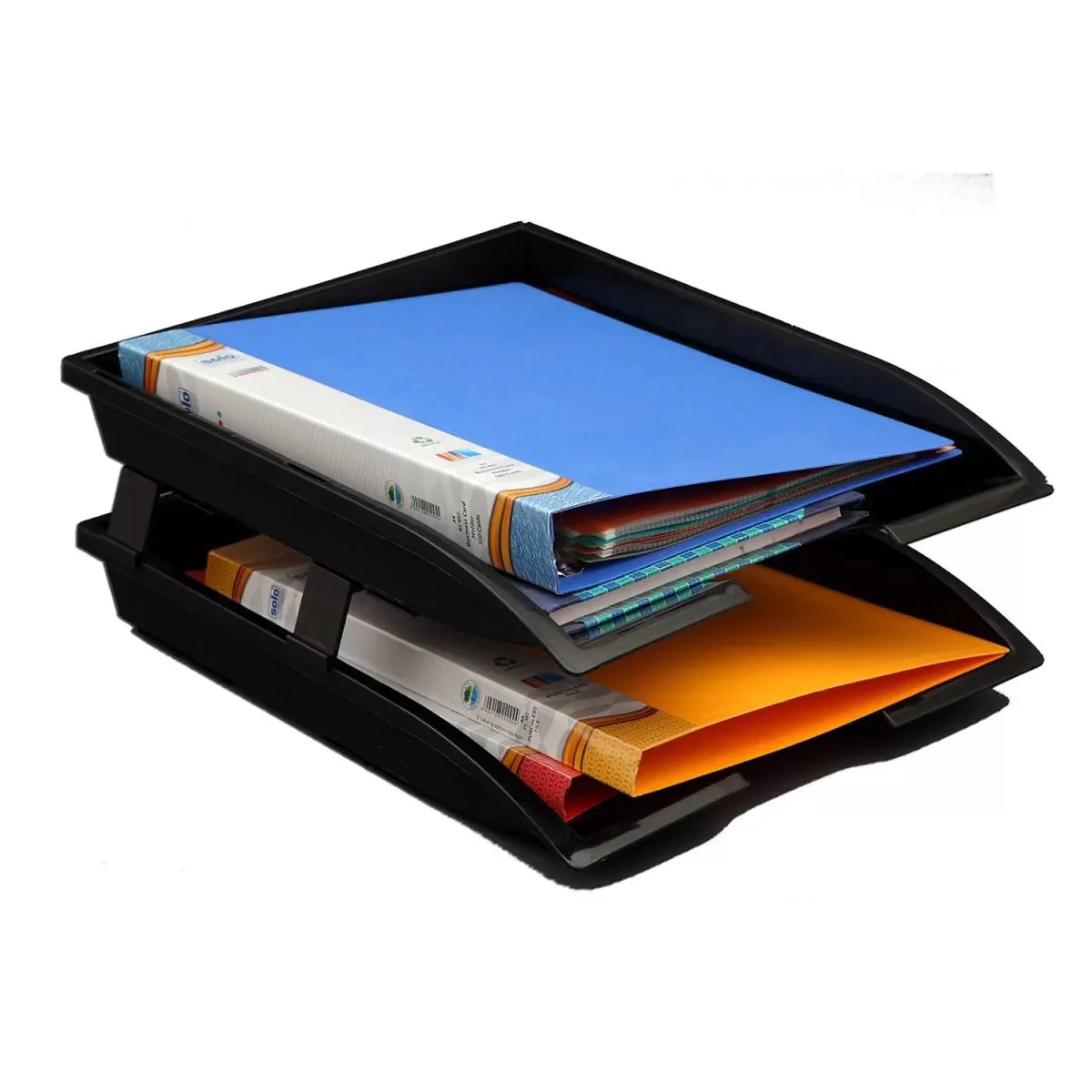 Solo office supplies are extensively used by students and business professionals for official as well as personal purposes owing to their wide range of products. The Solo Paper & File Tray consists of 2 Extra Large Compartments to accommodate files and documents in bulk with ease. This Tray has special interlocking raisers to separate both trays from each other. Both the trays have been provided with adequate space between them to allow arms to reach deep inside to access small objects. These Trays are Tuff Built and both have the capacity of holding 1000 Sheets each. This Solo Paper & File Tray is a handy product and can be used for gifting purposes.